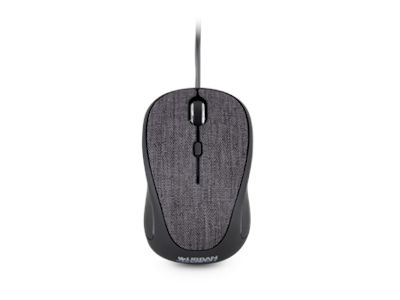 Souris USB filaire en tissu : Format compact, Résolution de la souris de 800 à 1600 DPI, Capteur optique ultra performant avec une fréquence de balayage de 3000 Fps, Résolution ajustable grâce au bouton supérieur, Souris à 3 boutons, Câble renforcé de 1.50m, Matériaux: ABS noir avec finition en tissu chiné sur le dessus