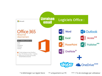 Office 365 Personnel pour PC et Mac vous offre la qualité du service Microsoft sur tous ses logiciels essentiels dans leur version complète durant un an : Word, Excel, Powerpoint, Outlook, OneNote*, Access** et Publisher**. Stockez tout dans votre Cloud personnel OneDrive de 1 To par utilisateur pour alléger votre disque dur et pour retrouver vos documents sur n’importe quel appareil enregistré avec votre compte Microsoft.